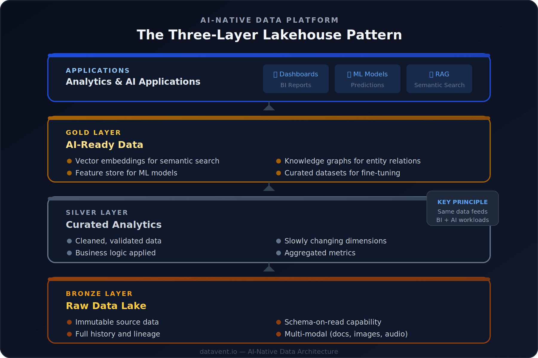 Gold Layer (AI-Ready Data): Vector embeddings for semantic search, feature stores for ML models, knowledge graphs for entity relations, and curated datasets for fine-tuning.
