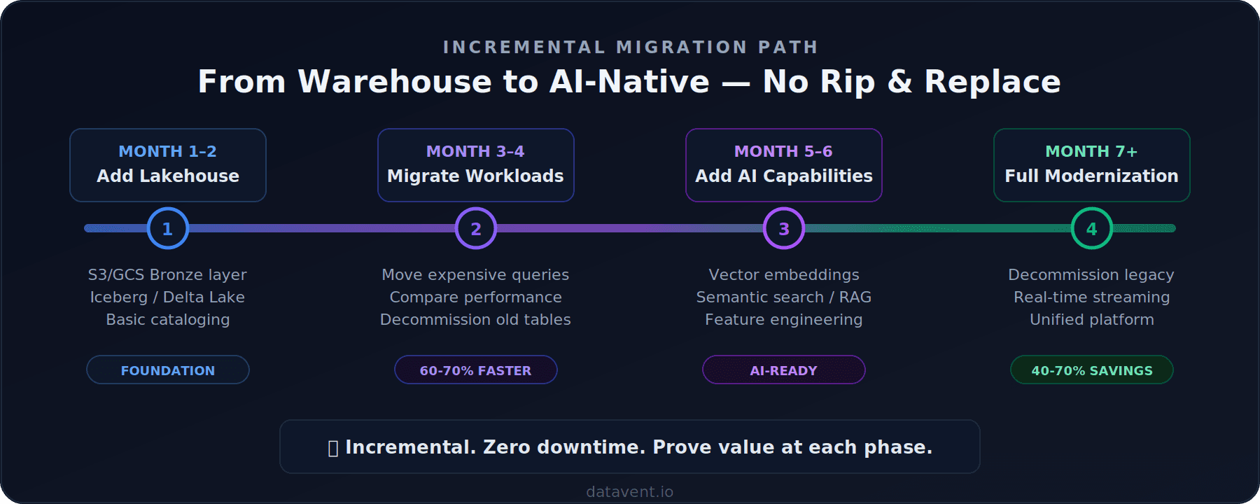Phase 1 — Add the Lakehouse Layer (Month 1-2): Stand up object storage as your Bronze layer, choose your table format (Iceberg or Delta Lake), and set up basic cataloging. You gain the foundation for multi-modal data and cost reduction.