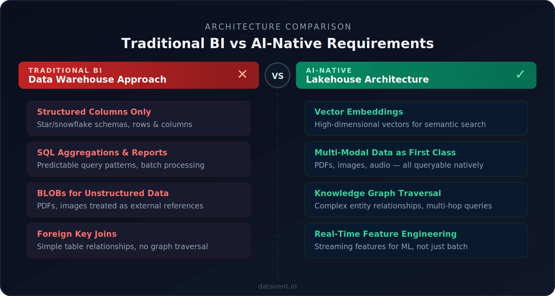 This isn't a coincidence. Traditional data warehouses were never designed for AI workloads. And the common approach of bolting vector databases onto existing analytics infrastructure creates more problems than it solves.