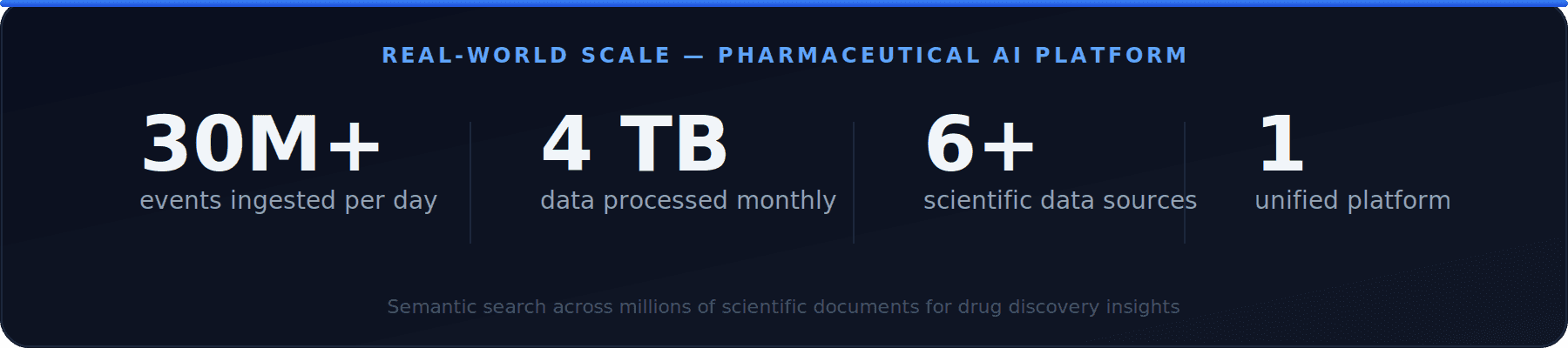We recently built an AI-native data platform for a pharmaceutical company processing scientific documents from 6+ sources—ingesting 30+ million events per day, processing 4TB of data monthly, extracting entities from unstructured scientific papers, powering semantic search across millions of documents, and enabling knowledge graph traversal for drug discovery insights.